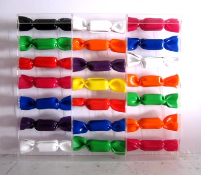 Après différentes investigations, elle parvient à maîtriser et dominer la matière plexiglas, pour obtenir la technique du Wrapping qui va lui permettre de réaliser la sculpture BONBON qui l’obsède depuis de nombreuses années.